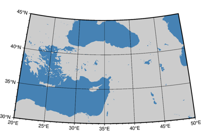 >>> import pygmt >>> # Create a new plot with pygmt.Figure() >>> fig = pygmt.Figure() >>> # Call the coast method for the plot >>> fig.coast( ... # Set the projection to Mercator, and the plot width to 10 centimeters ... projection="M10c", ... # Set the region of the plot ... region=[-10, 30, 30, 60], ... # Set the frame of the plot, here annotations and major ticks ... frame="a", ... # Set the color of the land to "darkgreen" ... land="darkgreen", ... # Set the color of the water to "lightblue" ... water="lightblue", ... # Draw national borders with a 1-point black line ... borders="1/1p,black", ... ) >>> # Show the plot >>> fig.show()